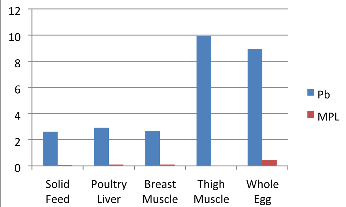 The prevalence of Lead, a non-essential element, was observed in all of the samples from solid feed to egg yolk. Contamination of the samples with Lead beyond allowed limits is alarming. All chemicals and HMs reach first to the Liver for detoxification to less toxic metabolites and excretion therefore, the concentration of Lead is high in the Liver. But Lead presence in feed, as well as liver, muscles, and eggs, marks its bioaccumulation. Consumption of Lead accumulated meat or eggs may lead to cancer, blood, and nervous disorders and is specifically detrimental for children.