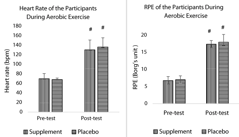 Figure 2: Heart rate and rate of perceived exertion of the participants during aerobic exercise in the supplement and placebo trials. Data is presented as mean ± SD. #denotes significant difference from respective pre-test values at p < 0.05.
